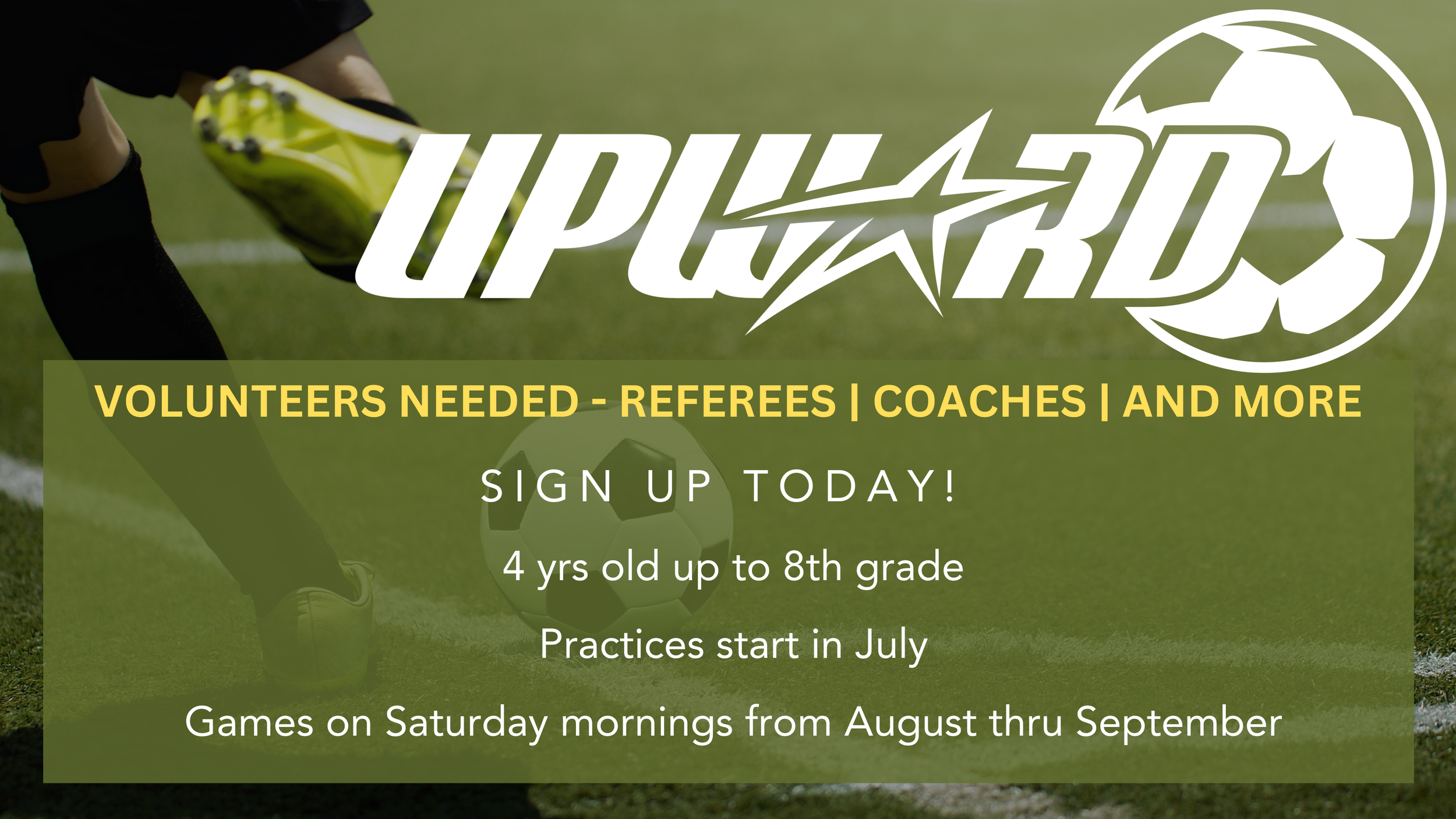 Sign-ups for our Summer/Fall Upward Soccer League is coming soon. All sign ups will be online here at our websiteI. Right now we are looking for those who would like to serve in any capacity to make this year another success for the community. We are looking for coaches, assistant coaches, referees, as well as people to help set-up and tear down practice fields.