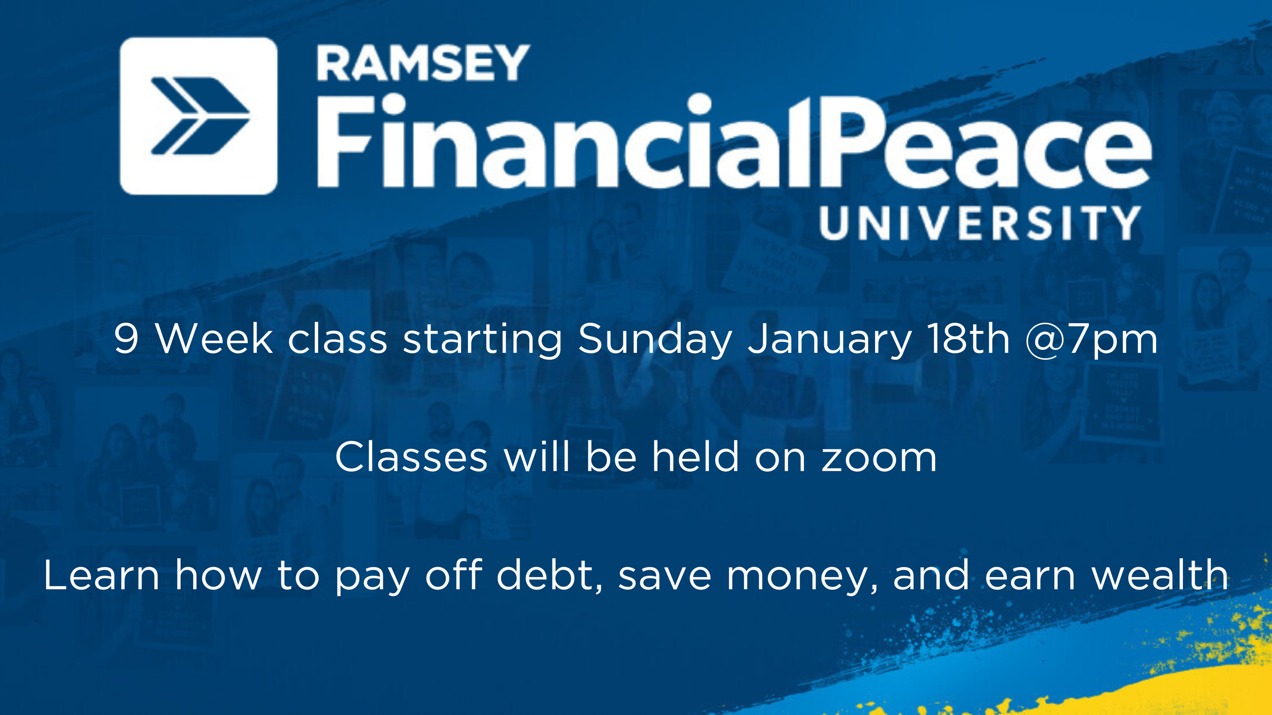 This is a 9 week class starting January 18th and held via zoom. Dave Ramsey’s Financial Peace University is a great way to learn how to pay off debt, life debt free, manage and save money.